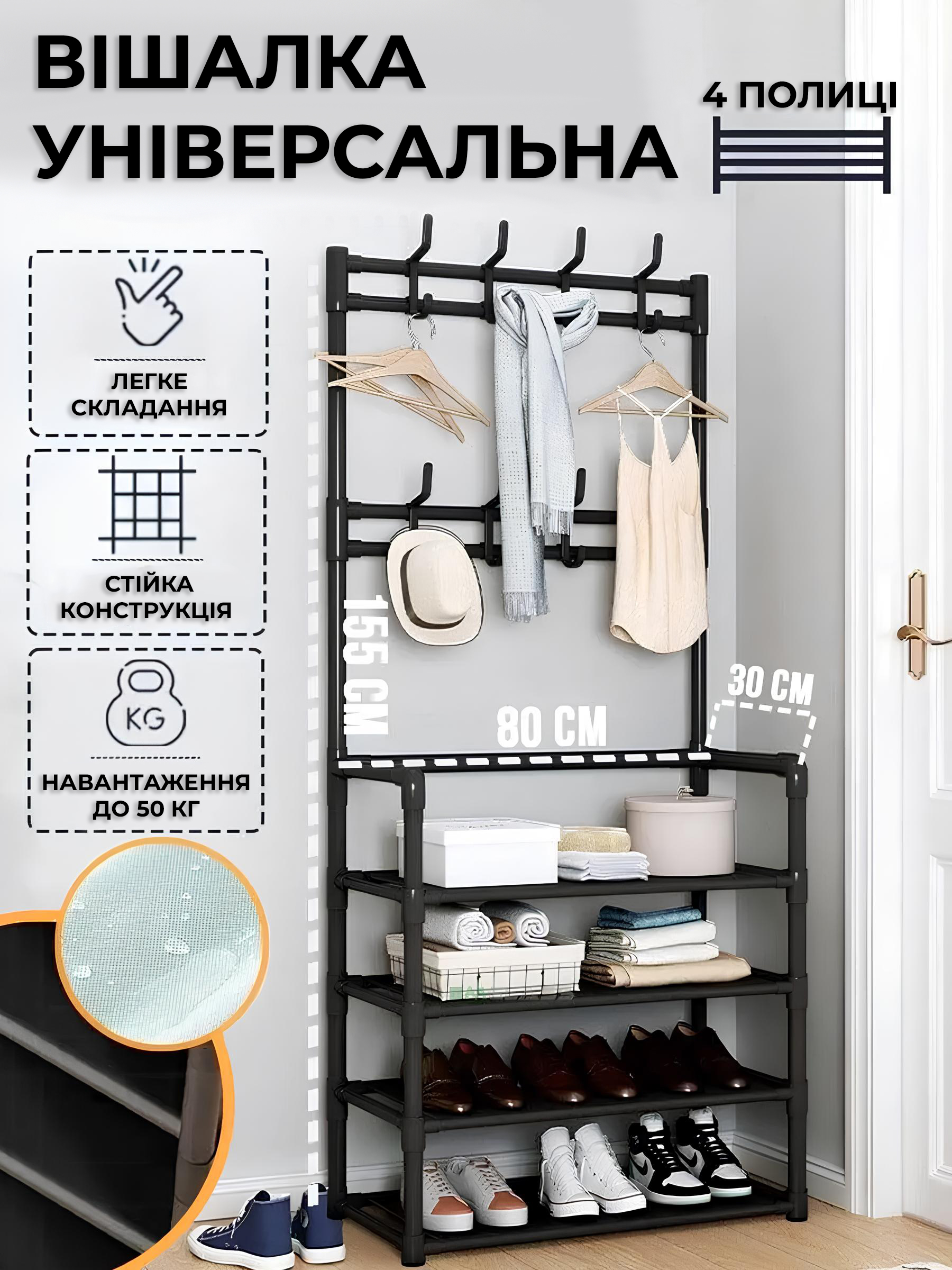 — ідеальне рішення для організації вашого передпокою чи гардеробу. Вона поєднує в собі полички для взуття, гачки для речей, місце для сумок та компактний сучасний вигляд. Створіть порядок з легкістю!