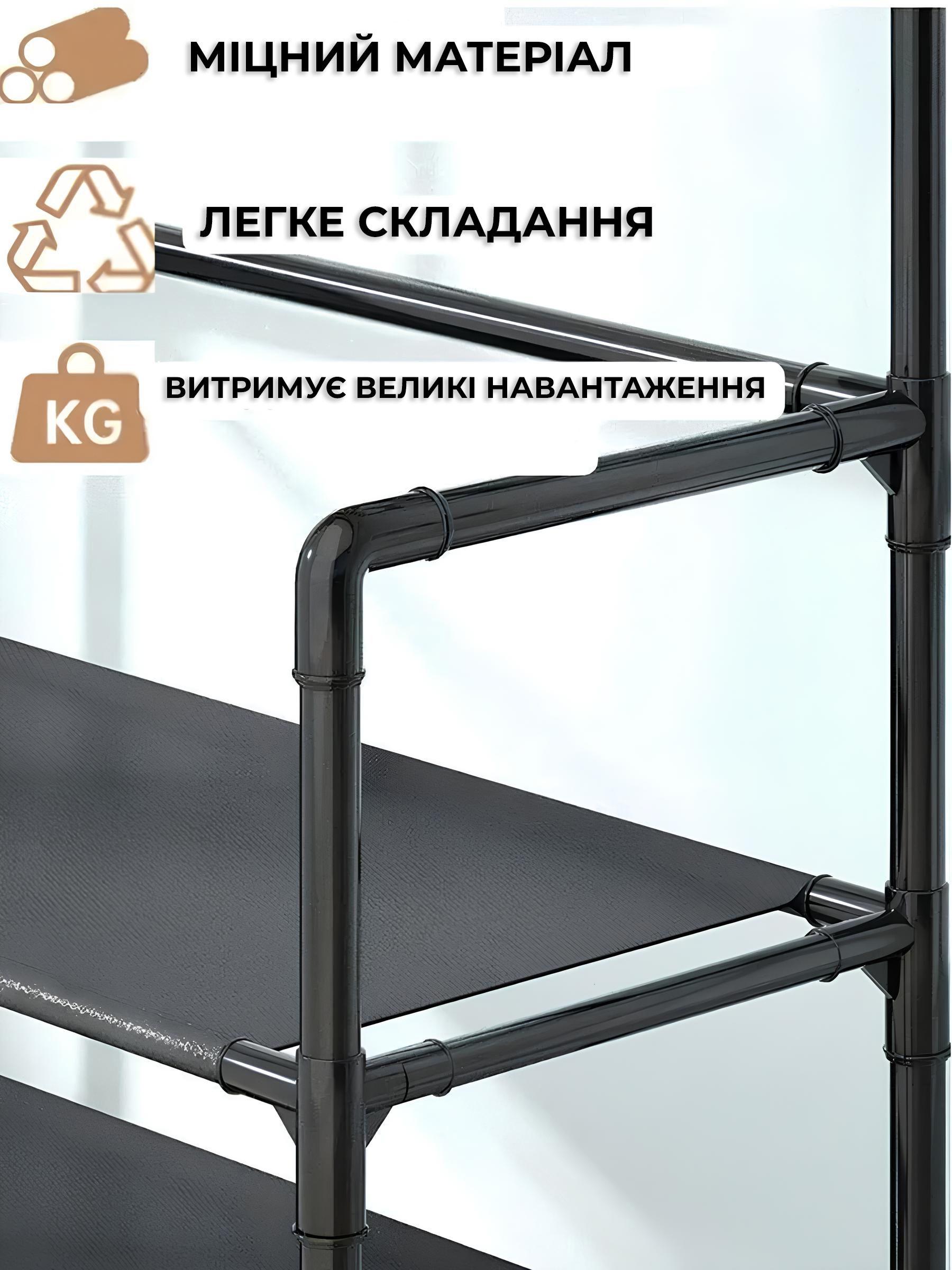 Завдяки надійному каркасу та стійкій структурі, вішалка витримує навантаження до 50 кг. Це означає, що на неї можна розміщувати взуття, сумки, куртки та інші речі без побоювань за деформацію чи розхитування. Ідеально підходить як для дому, так і для офісу.