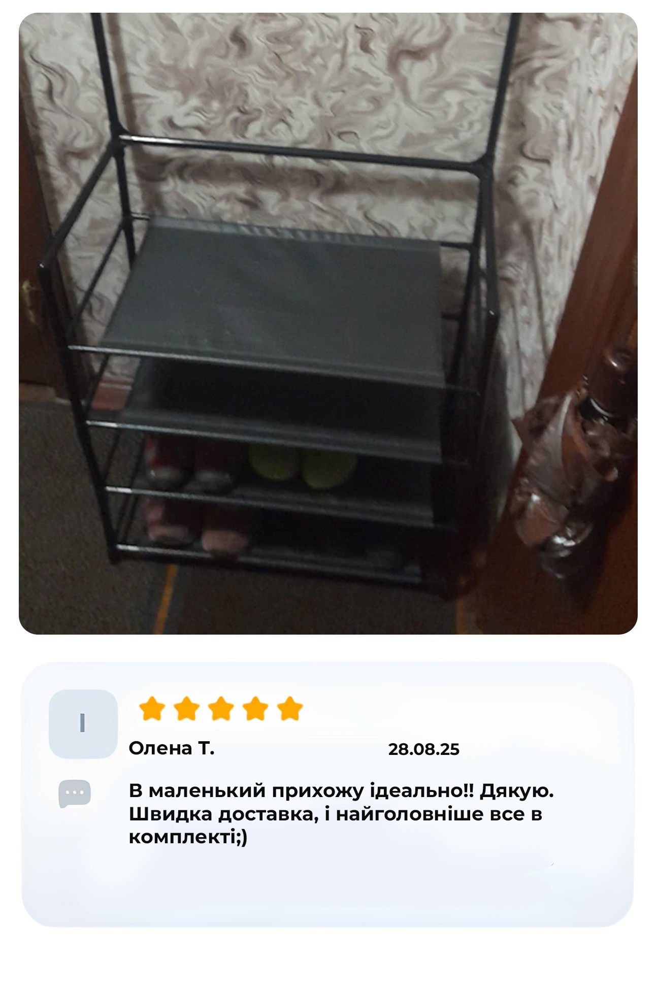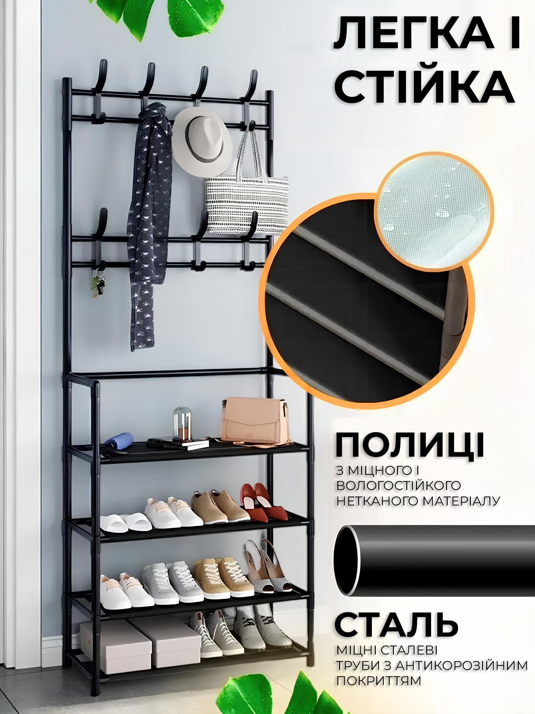 Завдяки надійному каркасу та стійкій структурі, вішалка витримує навантаження до 50 кг. Це означає, що на неї можна розміщувати взуття, сумки, куртки та інші речі без побоювань за деформацію чи розхитування. Ідеально підходить як для дому, так і для офісу.