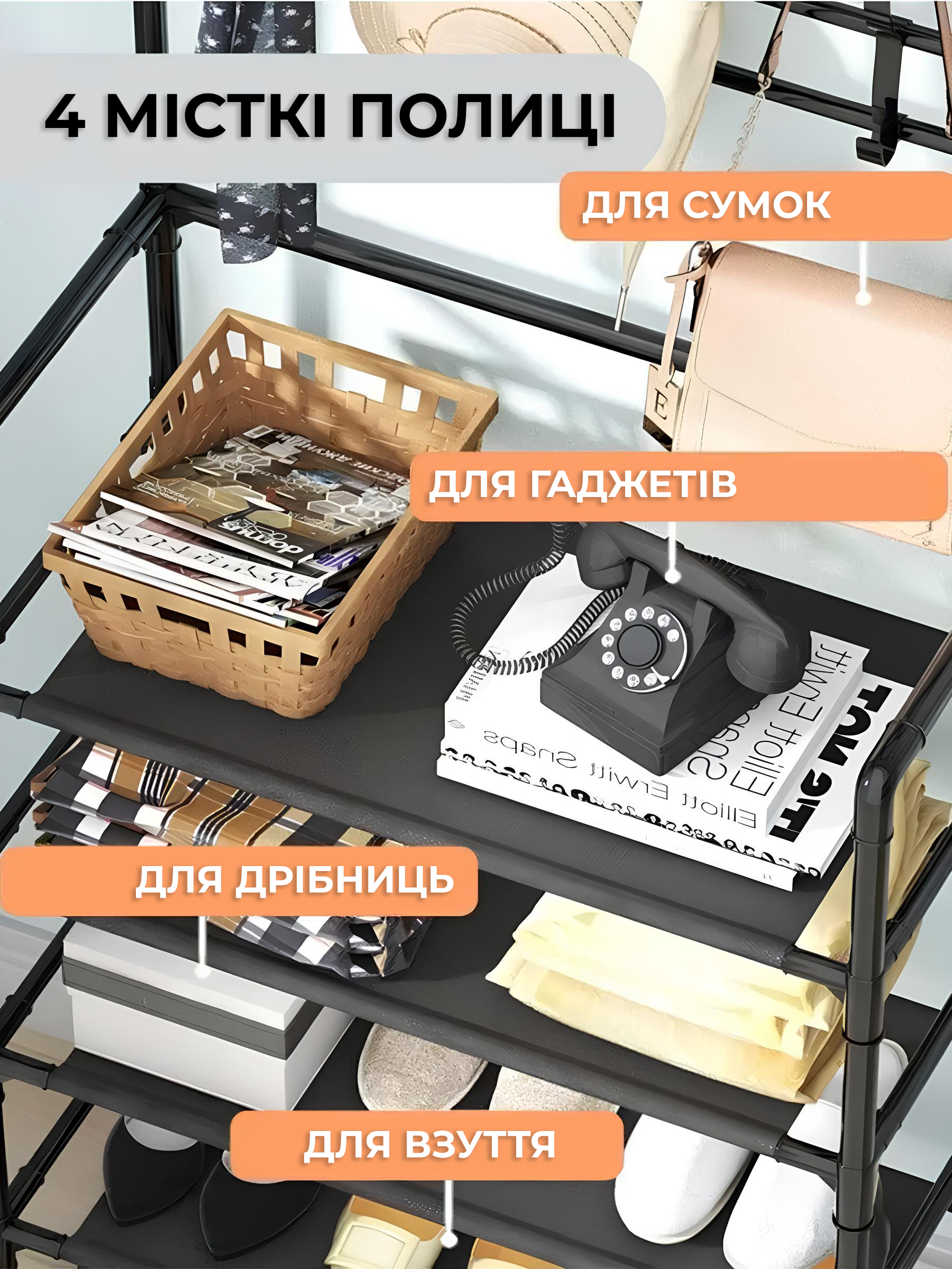 - Призначення: Зберігання одягу, взуття, сумок, аксесуарів
